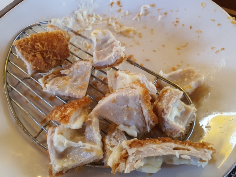 치즈돈까스를 칼로 썰었습니다.